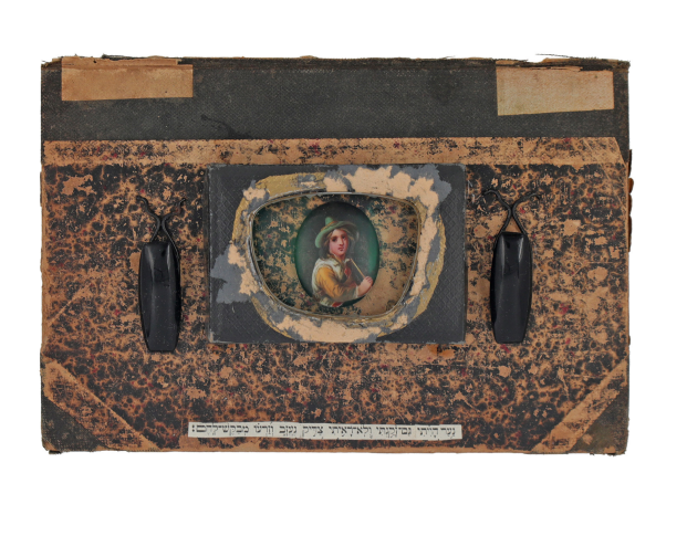Book cover, cardboard and glass box, Swiss mannequin on porcelain, a pair of black Hart Deco glass beetles